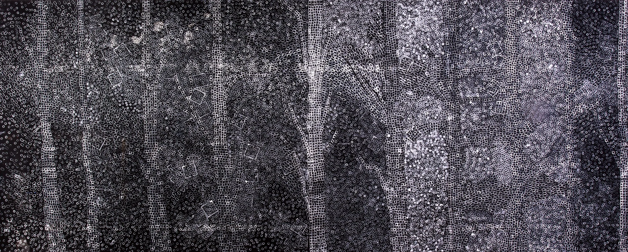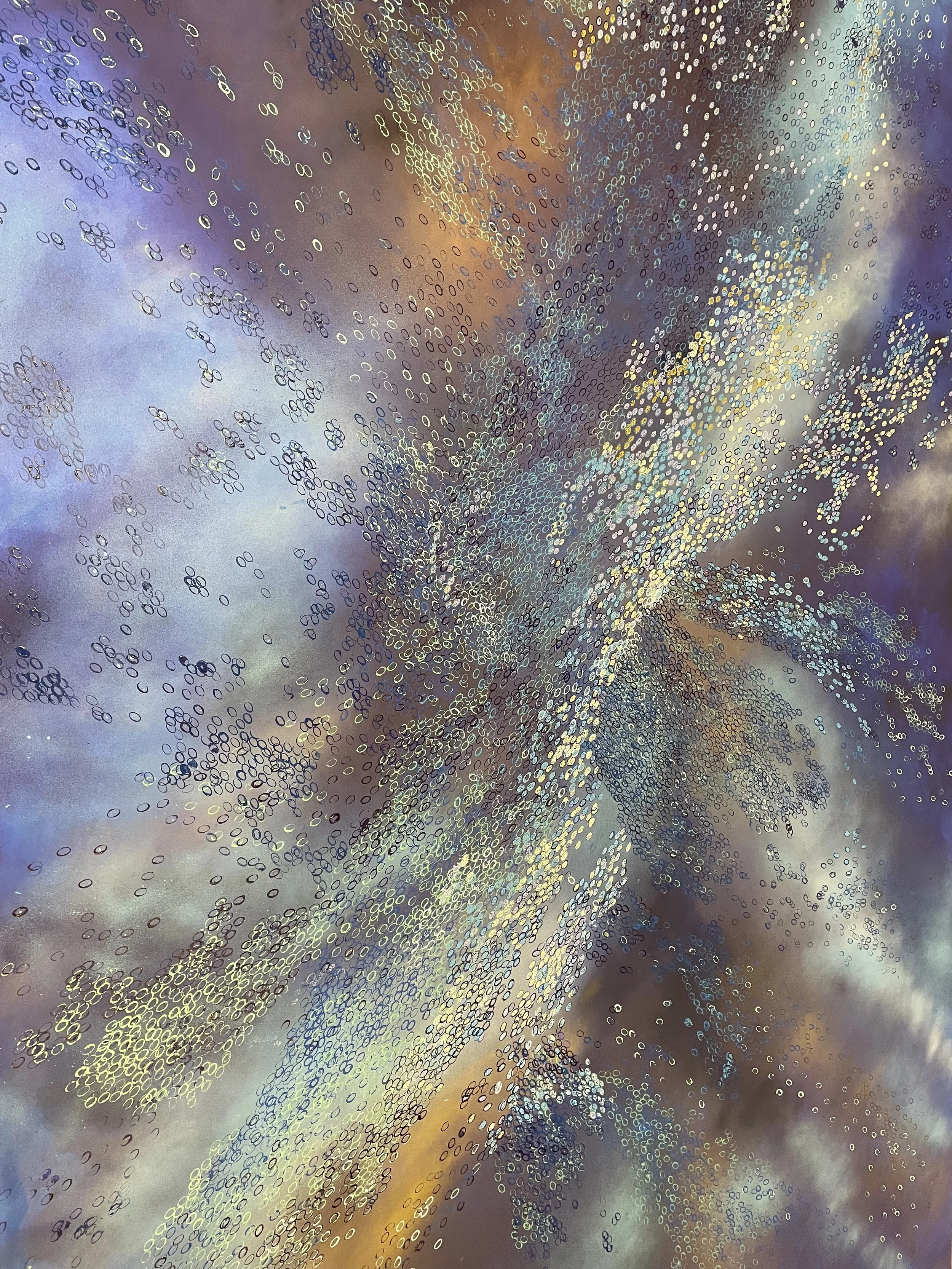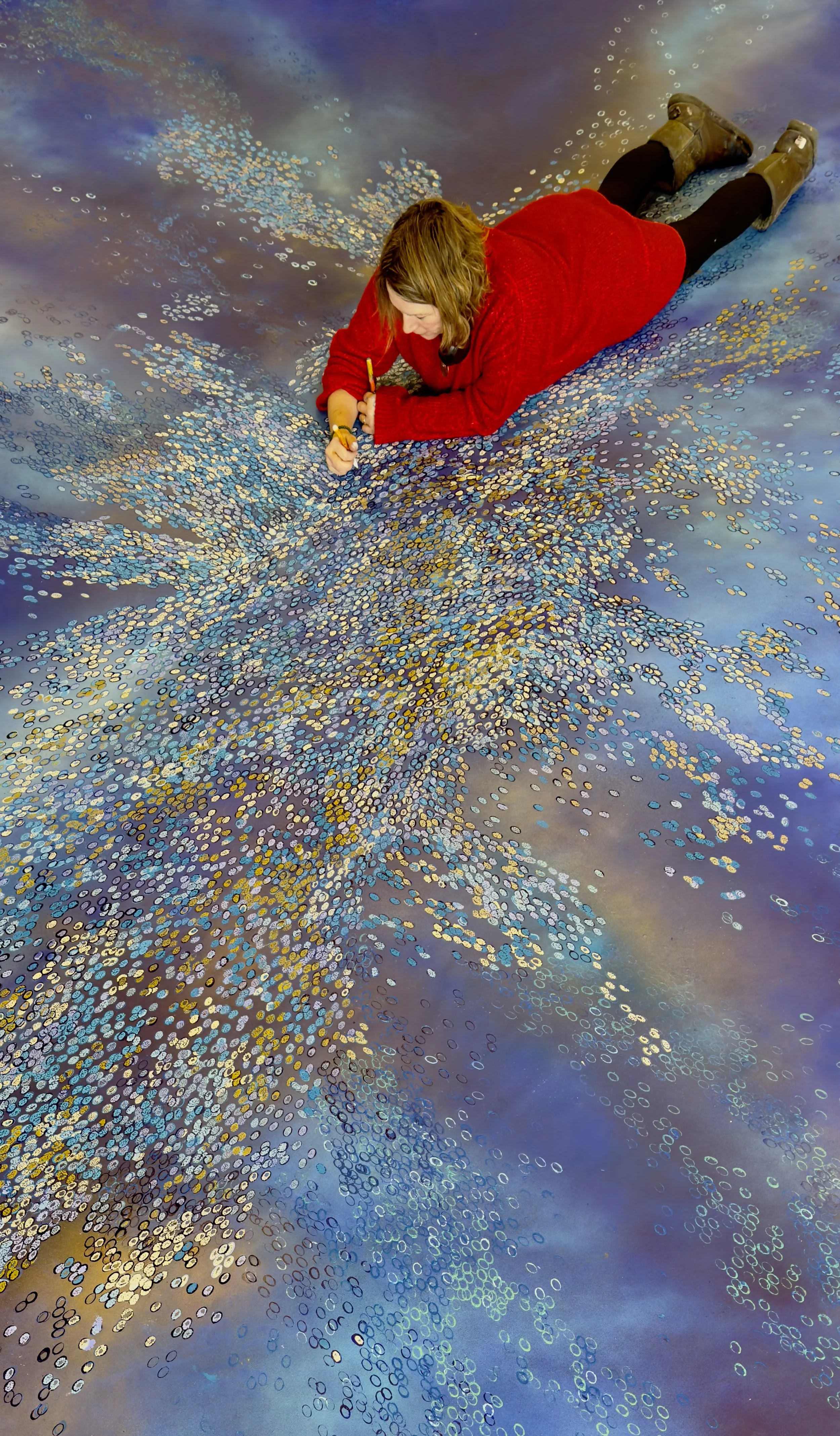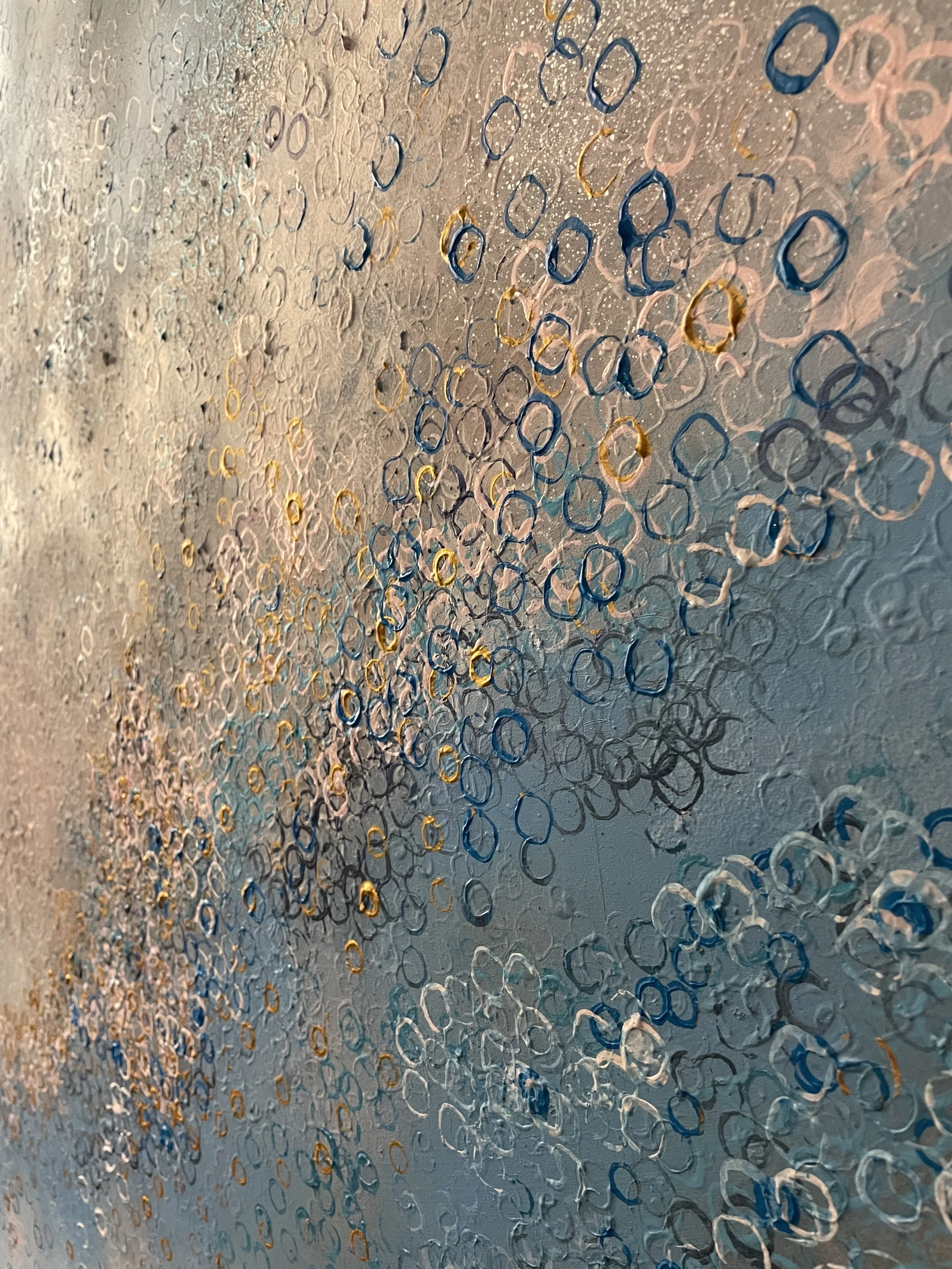 In 2024, I was commissioned by Co op Live, Manchesters newest and biggest entertainment venue to create an 8 metre painting for to the Waterside entrance of the Arena. The painting took 3 months to create and is made up of detailed mark making and dot work. I originally created the work on the floor of the old gym at my studio, it was then stretched onto a frame and installed at the venue. Being asked to create a Art work for such a pretigious and world famous venue is an achievement I am particulary proud to be a part of.